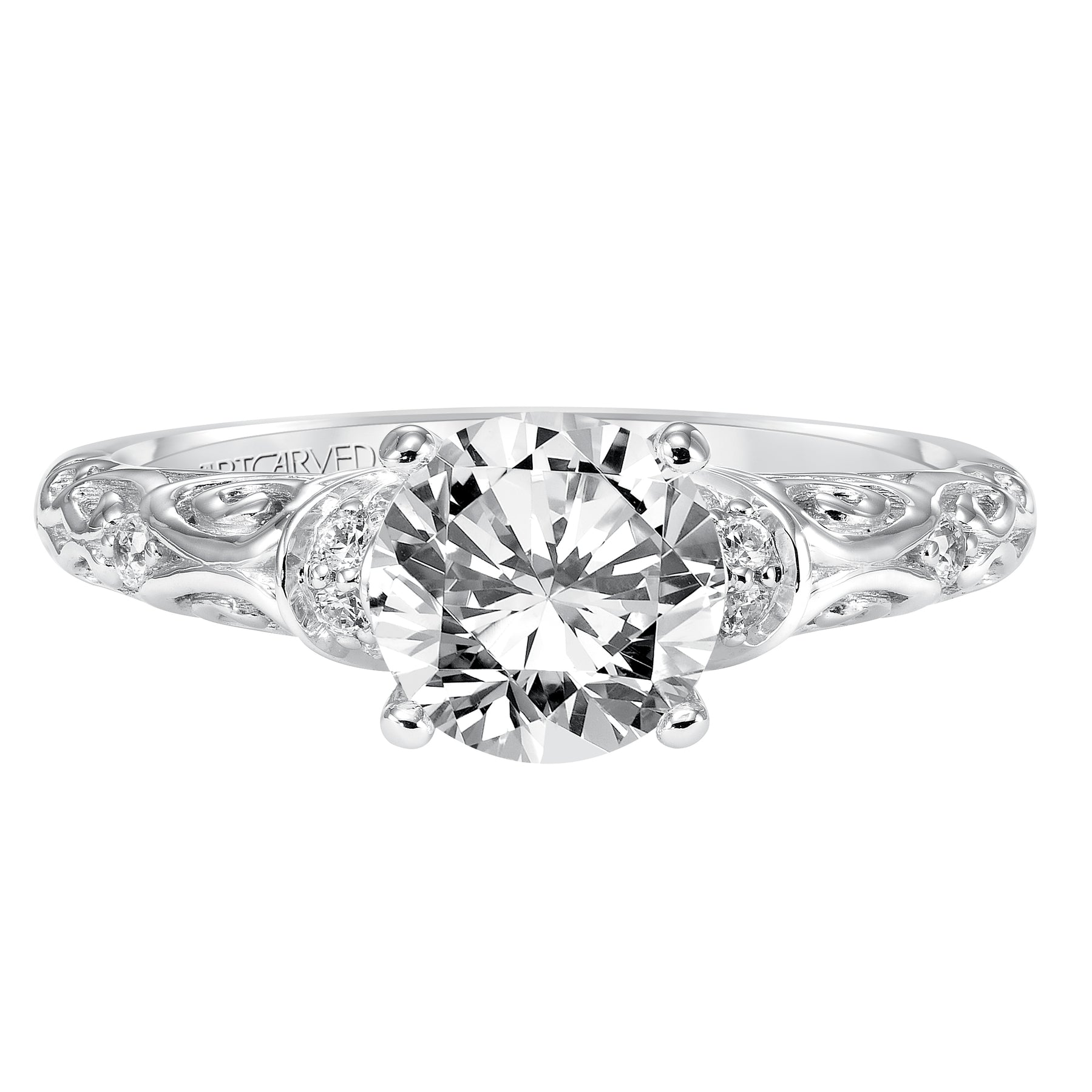 Diamond engagement ring with round center stone and carved diamond enhanced band