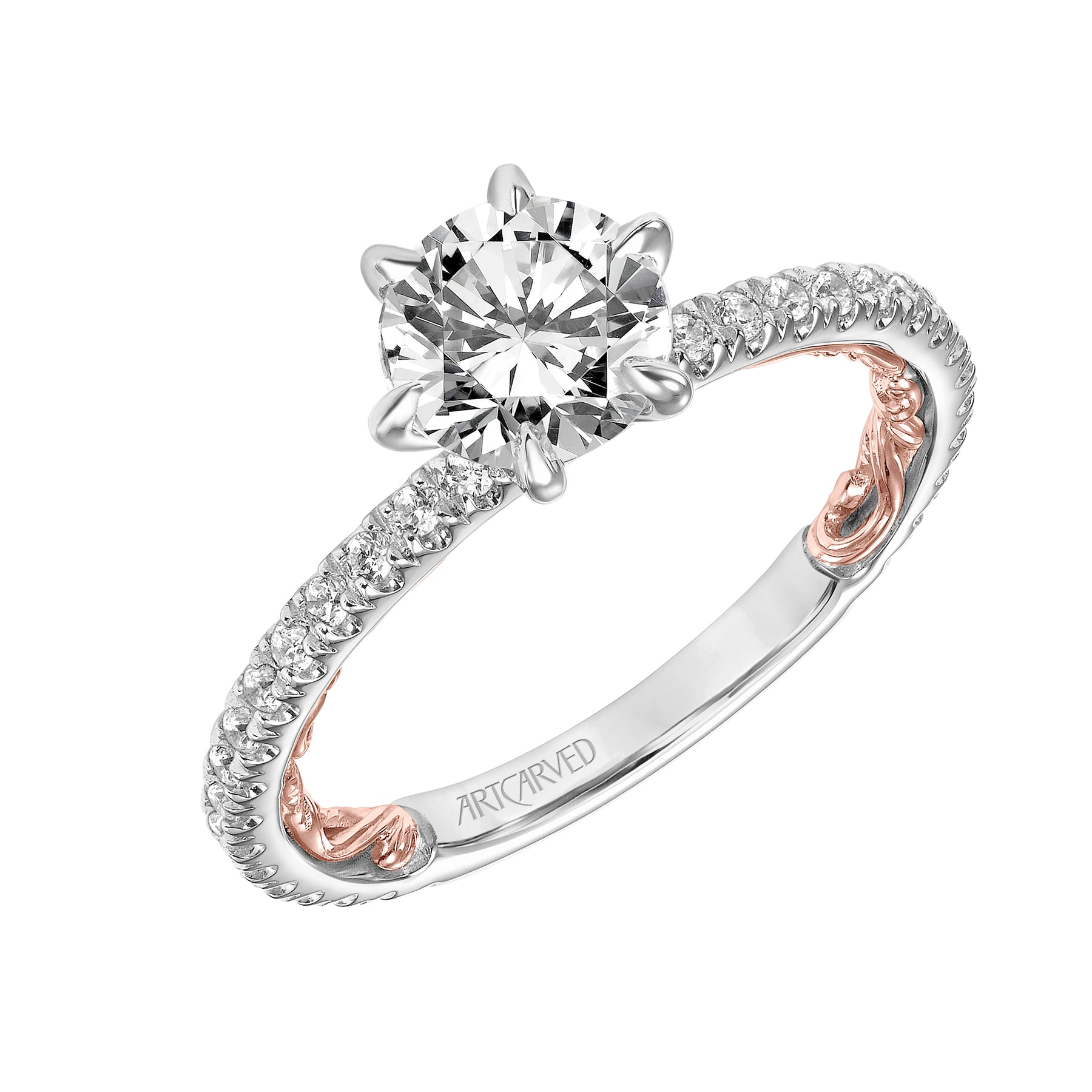 Lyric Engagement Ring with Six Prong Setting and Inner Carved details and Diamond Shank