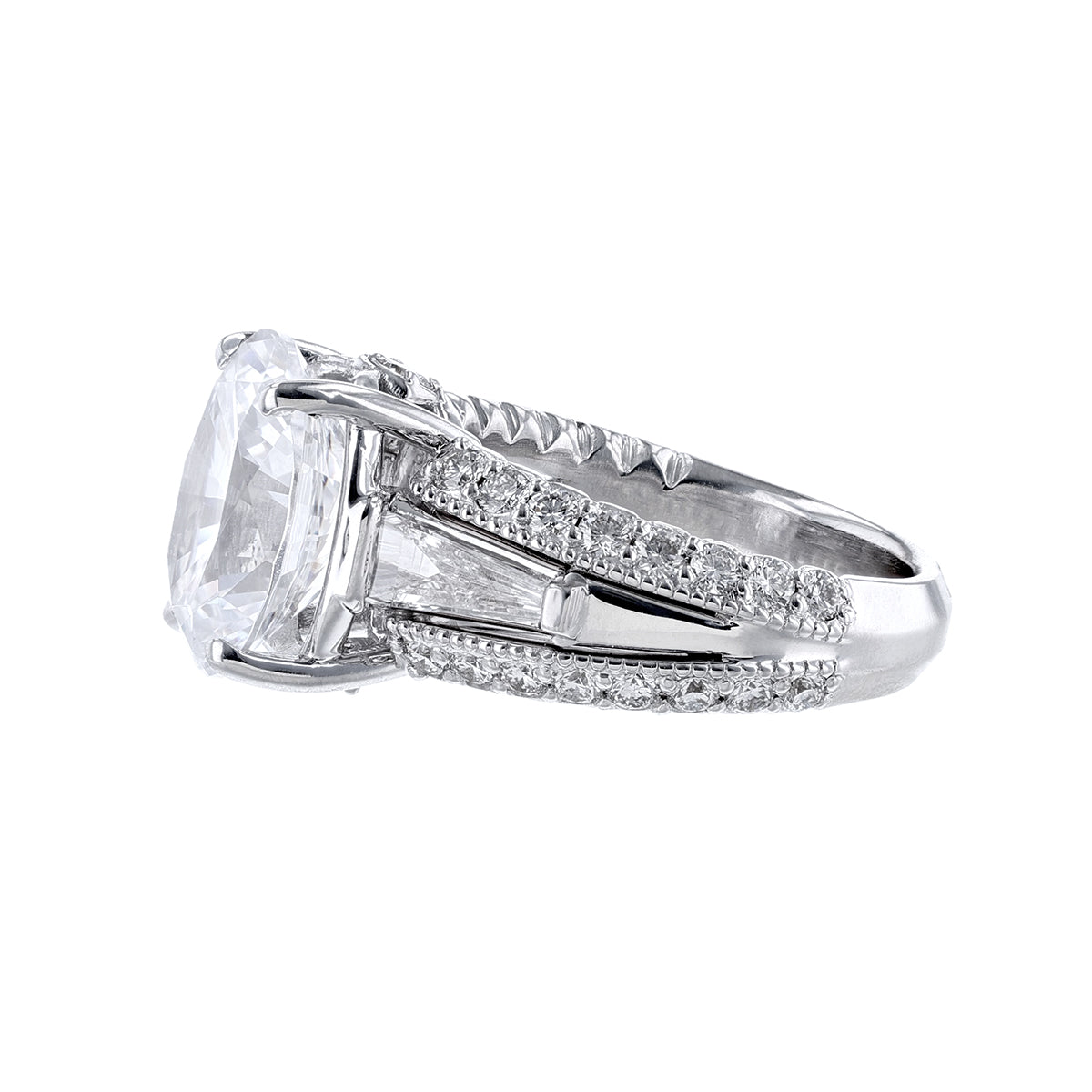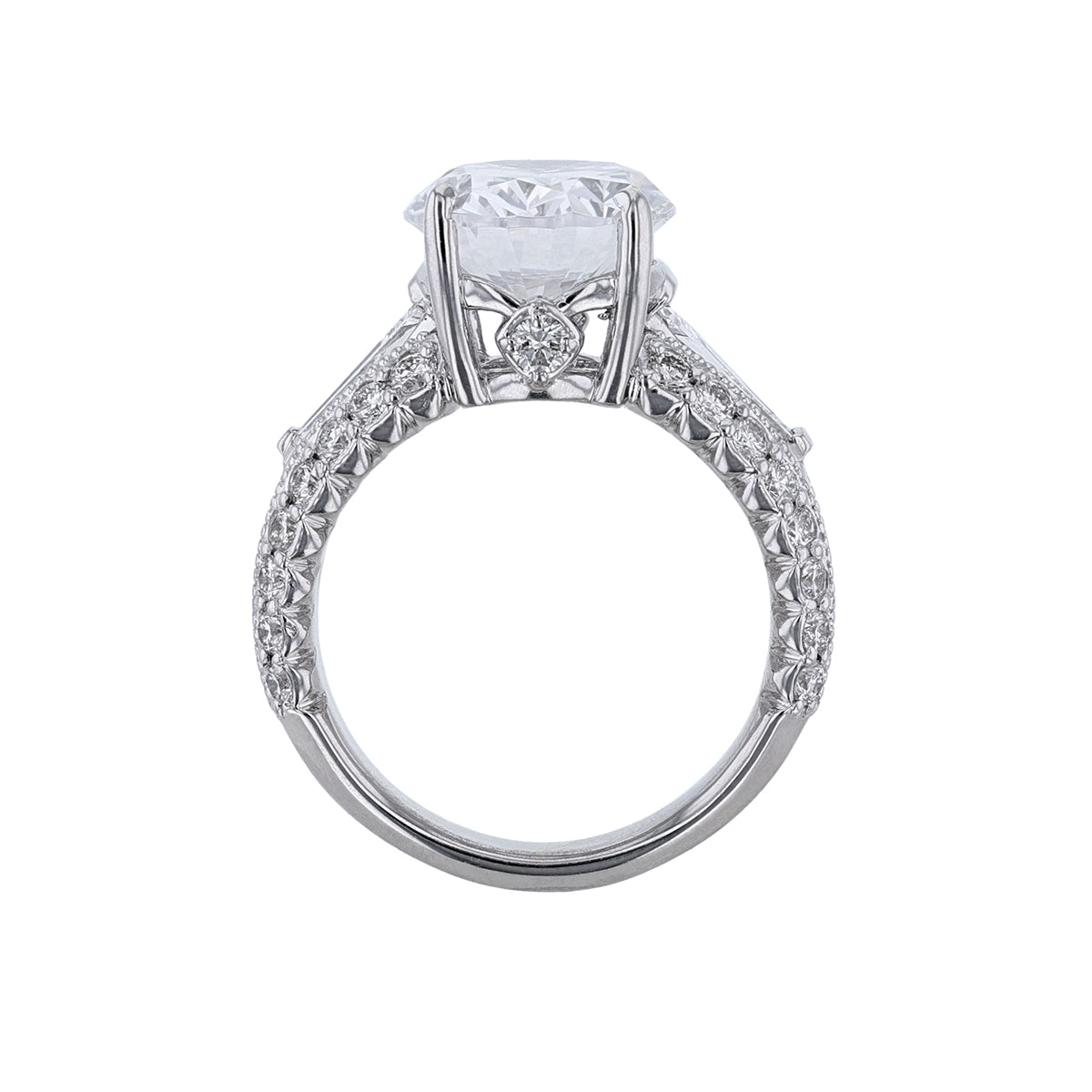 This mounting is 18K white gold featuring 32 round cut pave set diamonds. Includes 2 baguette diamonds holding the center diamond of your choosing, and 2 bezel set accent diamonds. Weighing 1.15 carats. \n \nCenter diamond not included. \n \n