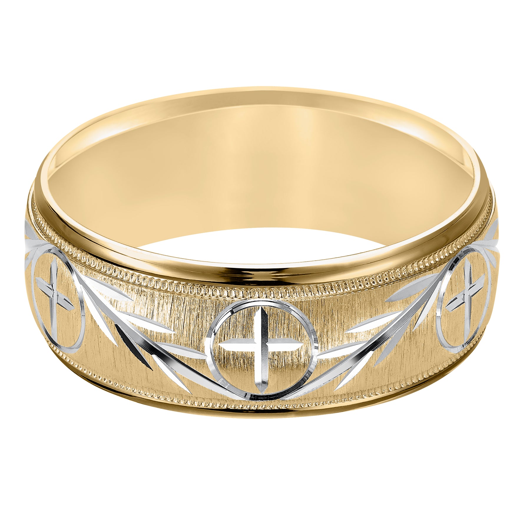 Additional Description This finely crafted, two-tone gold, wedding band features an exquisite design, satin finish with milgrain and round edges
