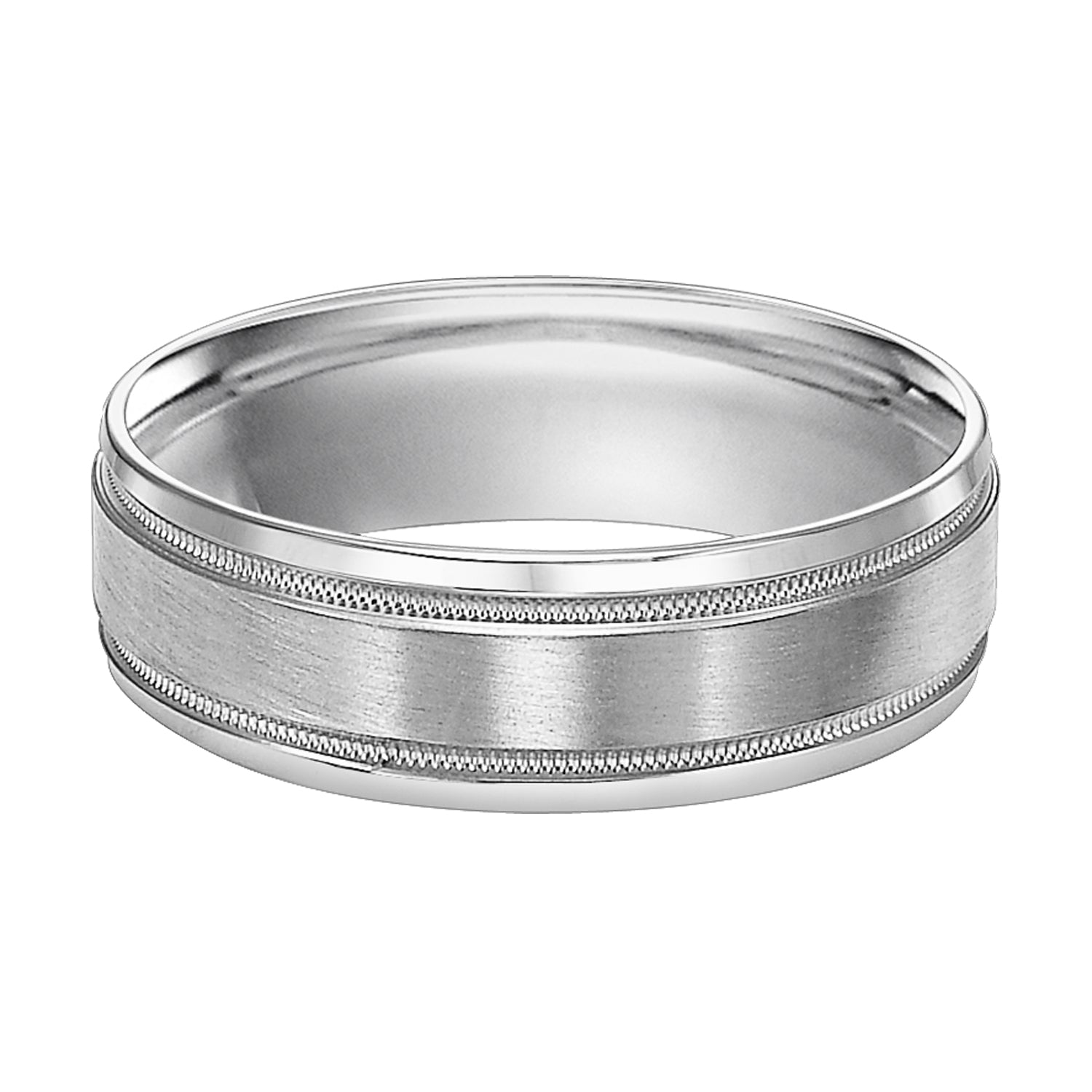 Additional Description Men's wedding band with satin finish, milgrain accent and bevel edges with flat profile