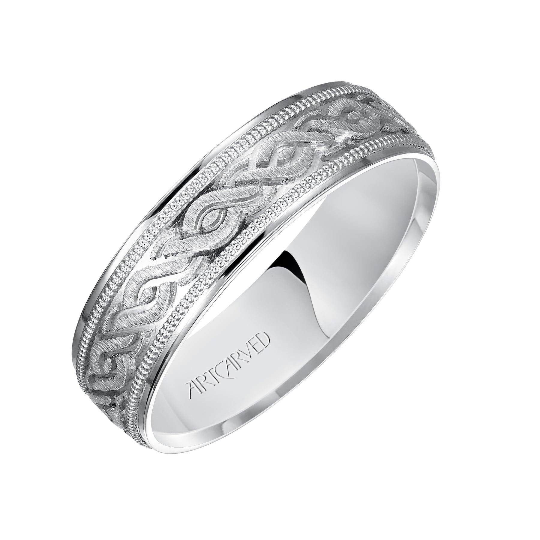 Comfort Fit, engraved wedding band with milgrain detail and flat edgess