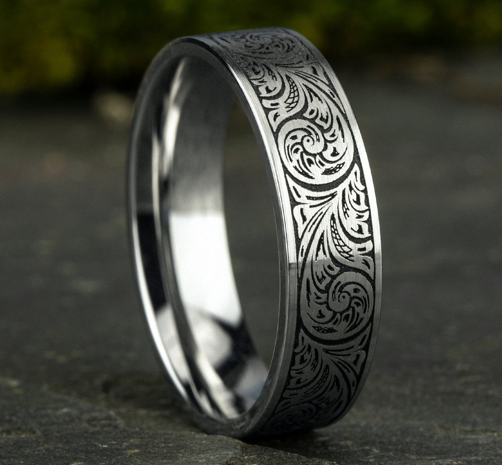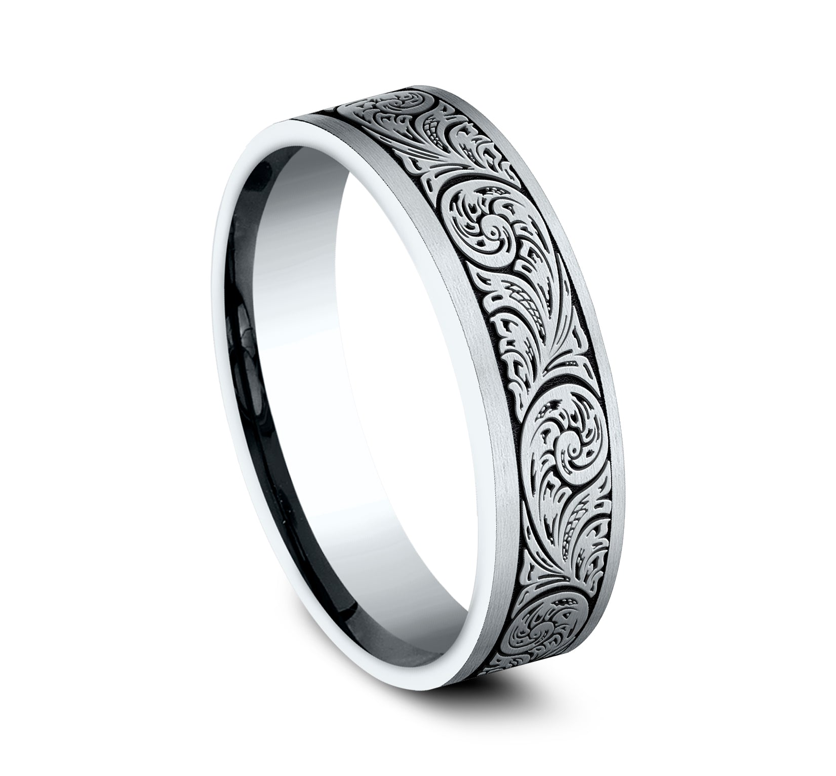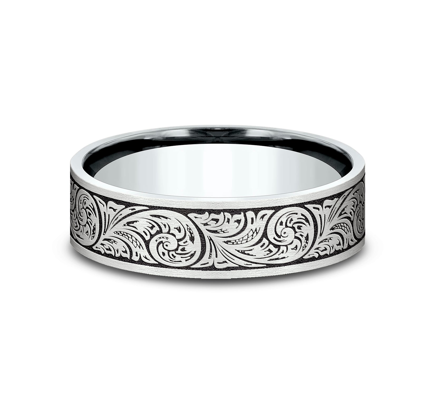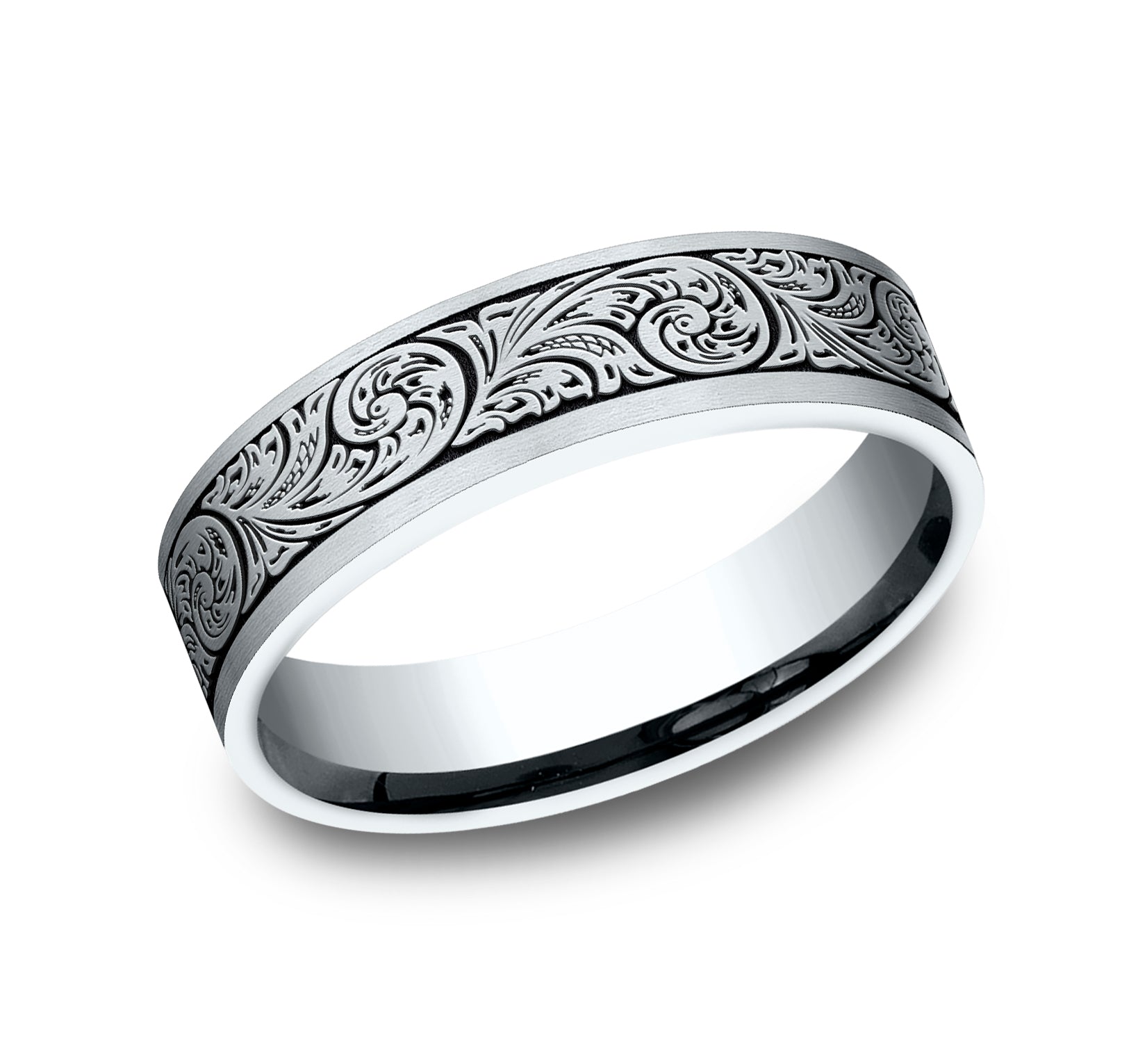 Additional Description | 6mm, Comfort fit 14K White Gold Vintage floral script patterned center with wear resistant black detailing |