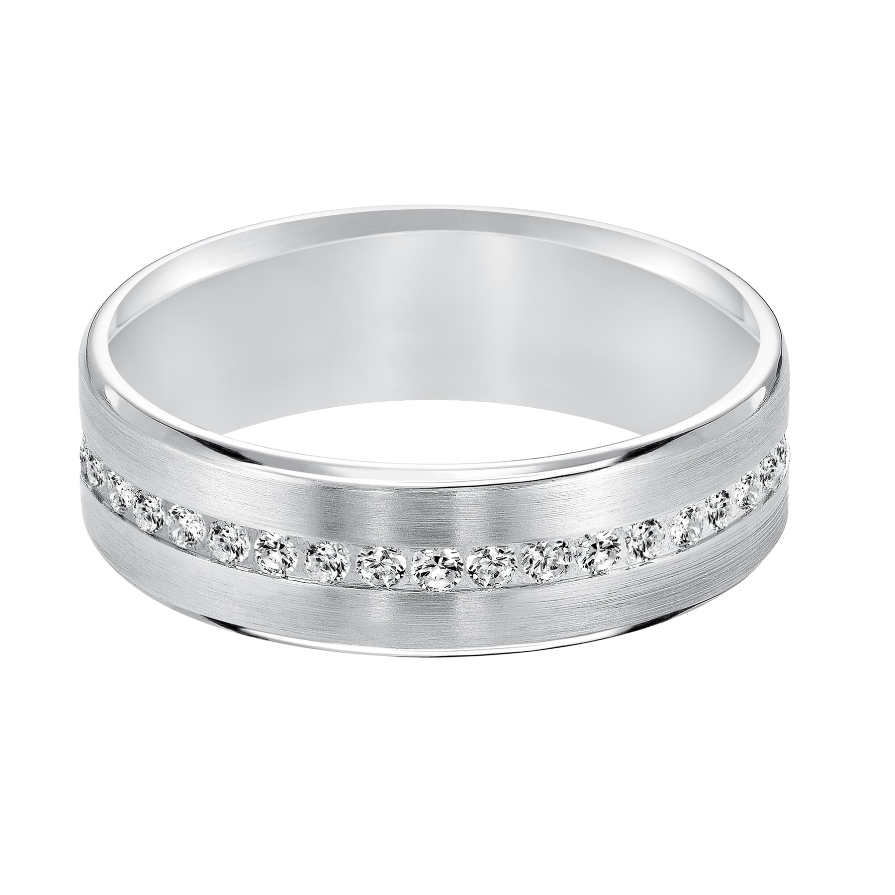 An Exquisite Row Diamonds Satin Finish and Rolled Edges Perfect the Luxurious Design of this Comfort Fit Wedding Band