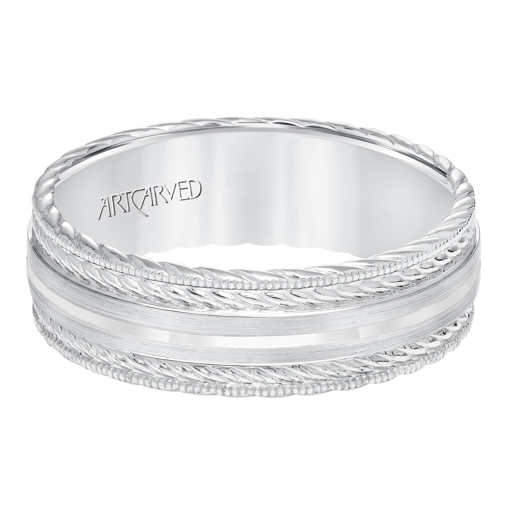 | Additional Description | Men's wedding band with satin finish and milgrain edge, rope treatment on top and the sides with flat profile. |