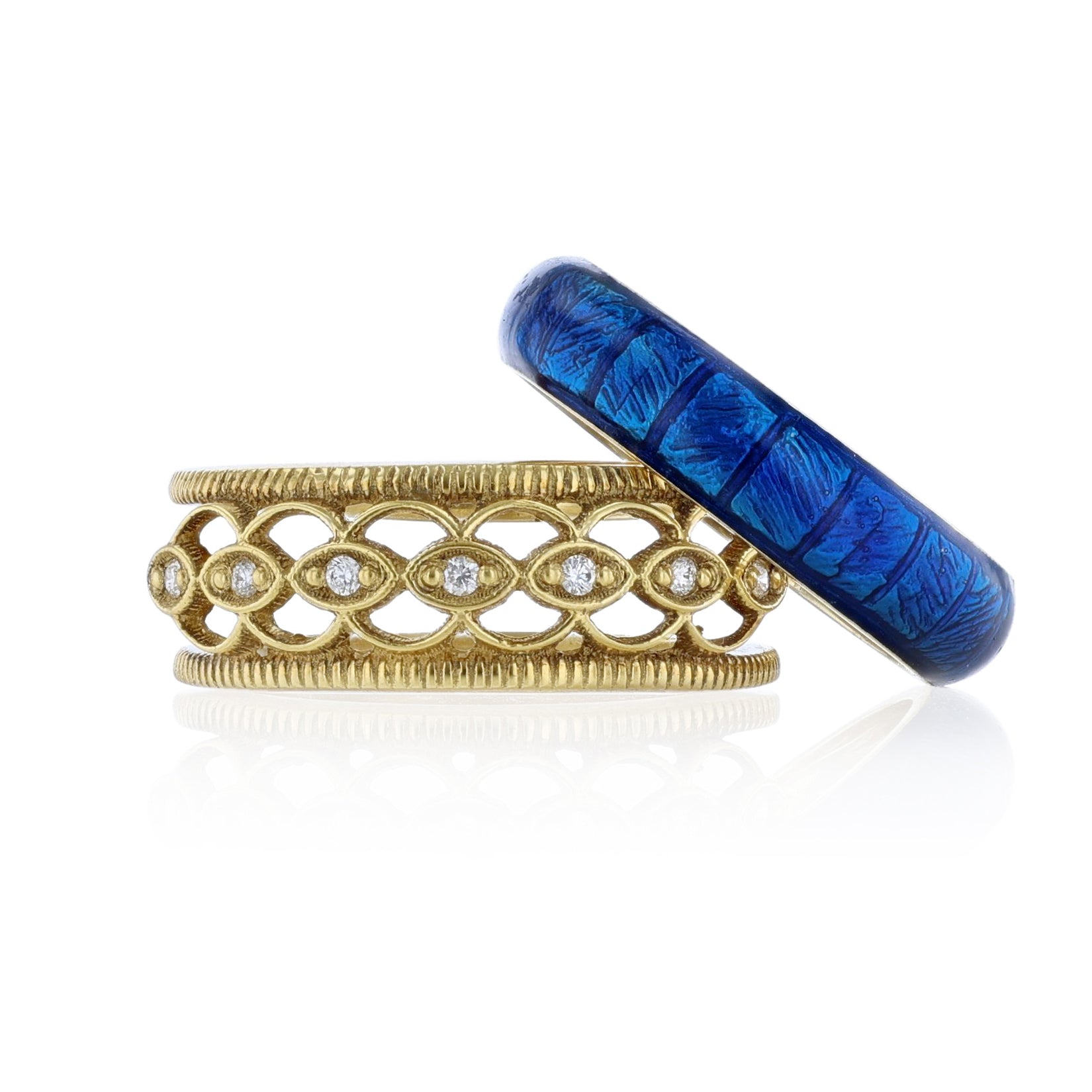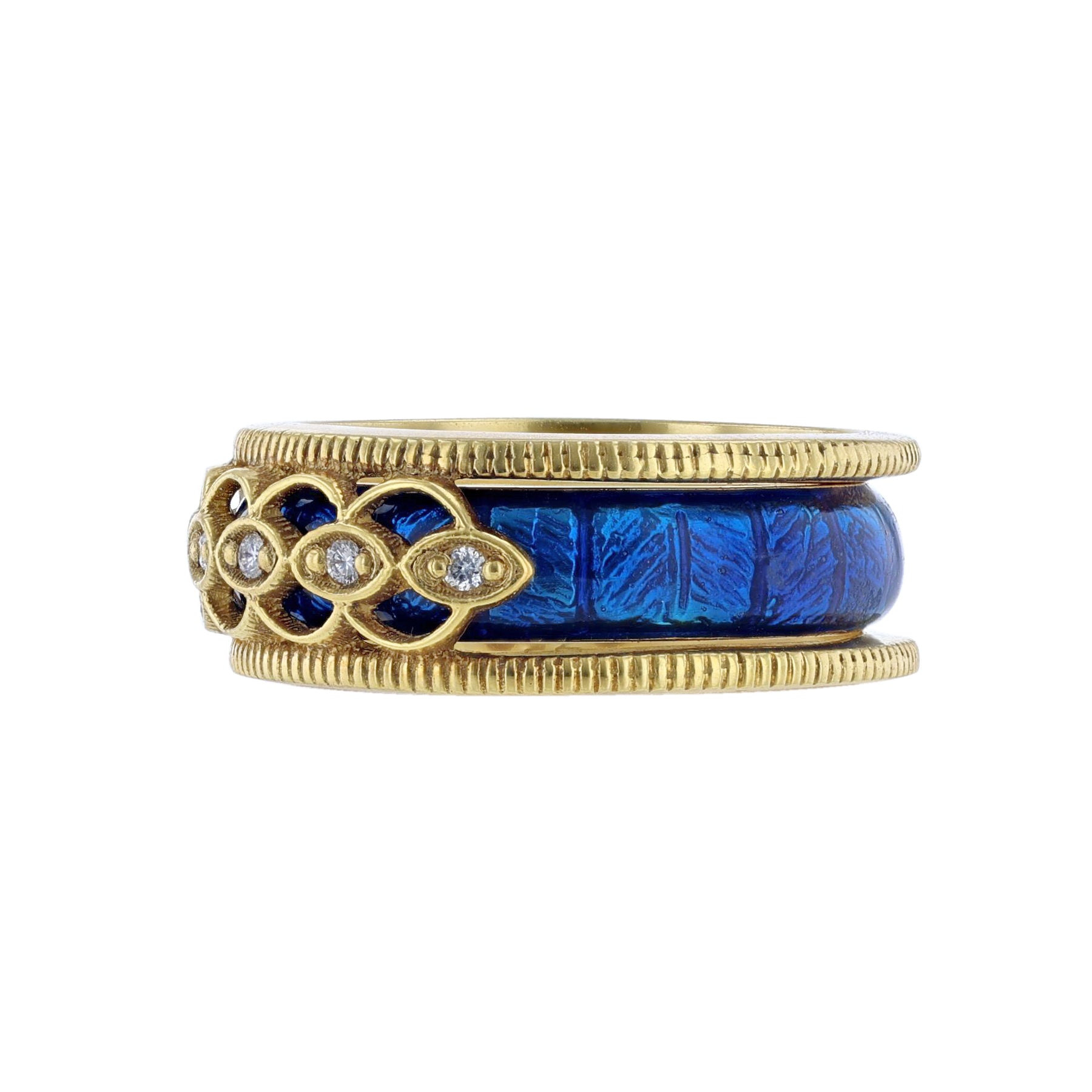 This versatile ring is a blue enamel ring with a jacket ring of 18k yellow gold. It features an 7 round cut diamonds. Weighing 0.08 carat combined.