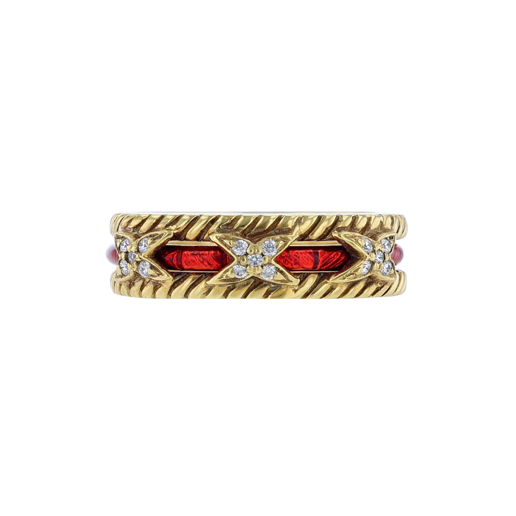 This versatile ring is a a jacket ring of 18k yellow gold. It features 3 "X"s with 15 round cut diamonds. Weighing 0.10 carat combined. Along with a red enamel ring insert.