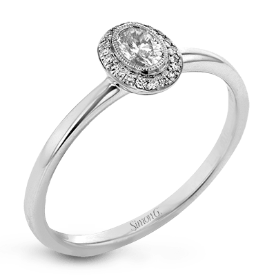 Additional Description | This exquisite, minimalist white gold ring features a halo containing .05 ctw of round white diamonds encircling a .17 ctw oval shaped white diamond Center stone not included. Our rings can be designed to fit any center stone. |