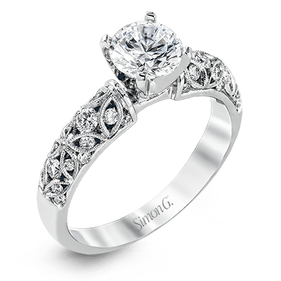 Additional Description | Featuring a delicate floral design, this white gold vintage engagement ring is set with .35 ctw of shimmering white diamonds. Center stone not included. Our rings can be designed to fit any center stone. |
