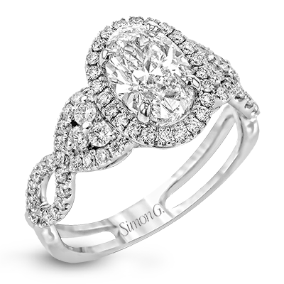 Additional Description Reflecting an intricate modern design, this remarkable white gold ring is emphasized by a lovely halo complemented with .59 ctw round cut white diamonds. Center stone not included. Our rings can be designed to fit any center stone.