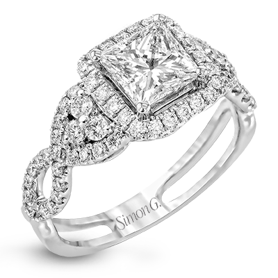 Additional Description | Reflecting an intricate modern design, this remarkable white gold ring is emphasized by a lovely halo complemented with .59 ctw round cut white diamonds. Center stone not included. Our rings can be designed to fit any center stone. |
