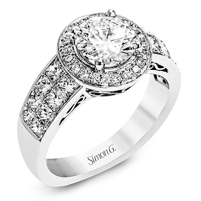Additional Description With a beautiful halo surrounding the center stone, this lovely white gold engagement ring is set with 1.14 ctw of shimmering princess cut white diamonds and .20 ctw round cut white diamonds. Center stone not included. Our rings can be designed to fit any center stone.