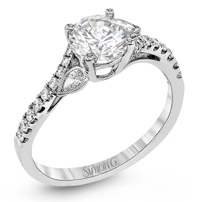 Additional Description This lovely 18k white gold engagement ring contains .20 ctw of white round brilliant diamonds, highlighted by .10 pear shaped white diamonds. Center stone not included. Our rings can be designed to fit any center stone.