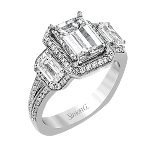 Additional Description This impressive white gold ring features .43 ctw emerald cut side diamonds and is accented with .38 ctw round cut diamonds. Center stone not included. Our rings can be designed to fit any center stone.
