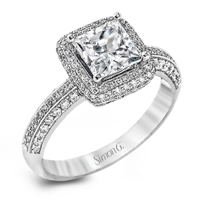 Additional Description | This vintage-inspired 18k white gold engagement ring is the perfect design for princess cut center stone because it has a detailed square shaped halo. The entire ring is set with .62 ctw of white diamonds. Center stone not included. Our rings can be designed to fit any center stone. |