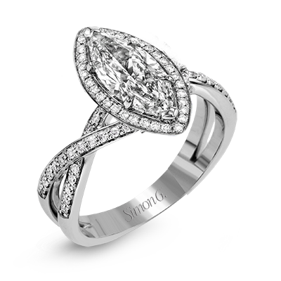 Additional Description This sparkling modern engagement ring features an eye-catching twisted design with elegant classic halo accented by .29 ctw of shimmering round cut white diamonds. Center stone not included. Our rings can be designed to fit any center stone.