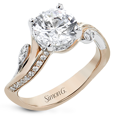This unique two-tone engagement ring has a sculpted look and accent diamonds 0.21 ctw set to look like petals and dew drops, flanking the center stone Center stone not included. Our rings can be designed to fit any center stone.