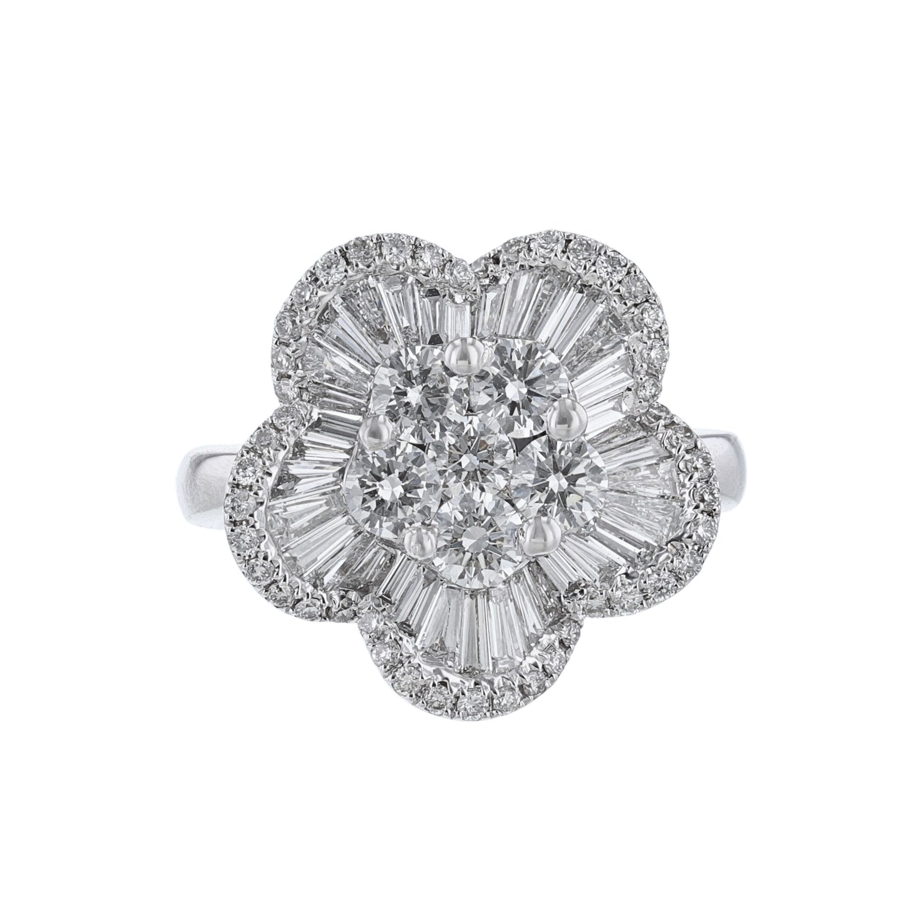 The ring is 18K white gold and features 6 center round cut diamonds. Surrounded by 35 tapered baguette cut diamonds and 45 round cut diamonds. Stones are prong and channel set and weigh 2.00 carats combined.