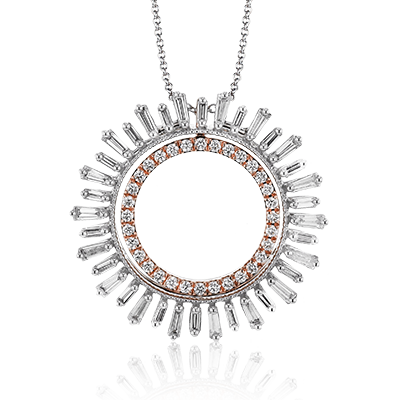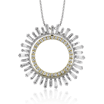 Additional Description | Make a statement with this two in one diamond pendant that features an inner circle of RD diamonds 0.26 ctw. set in yellow gold, with an outer orb of baguettes 1.04 ctw. in white gold |