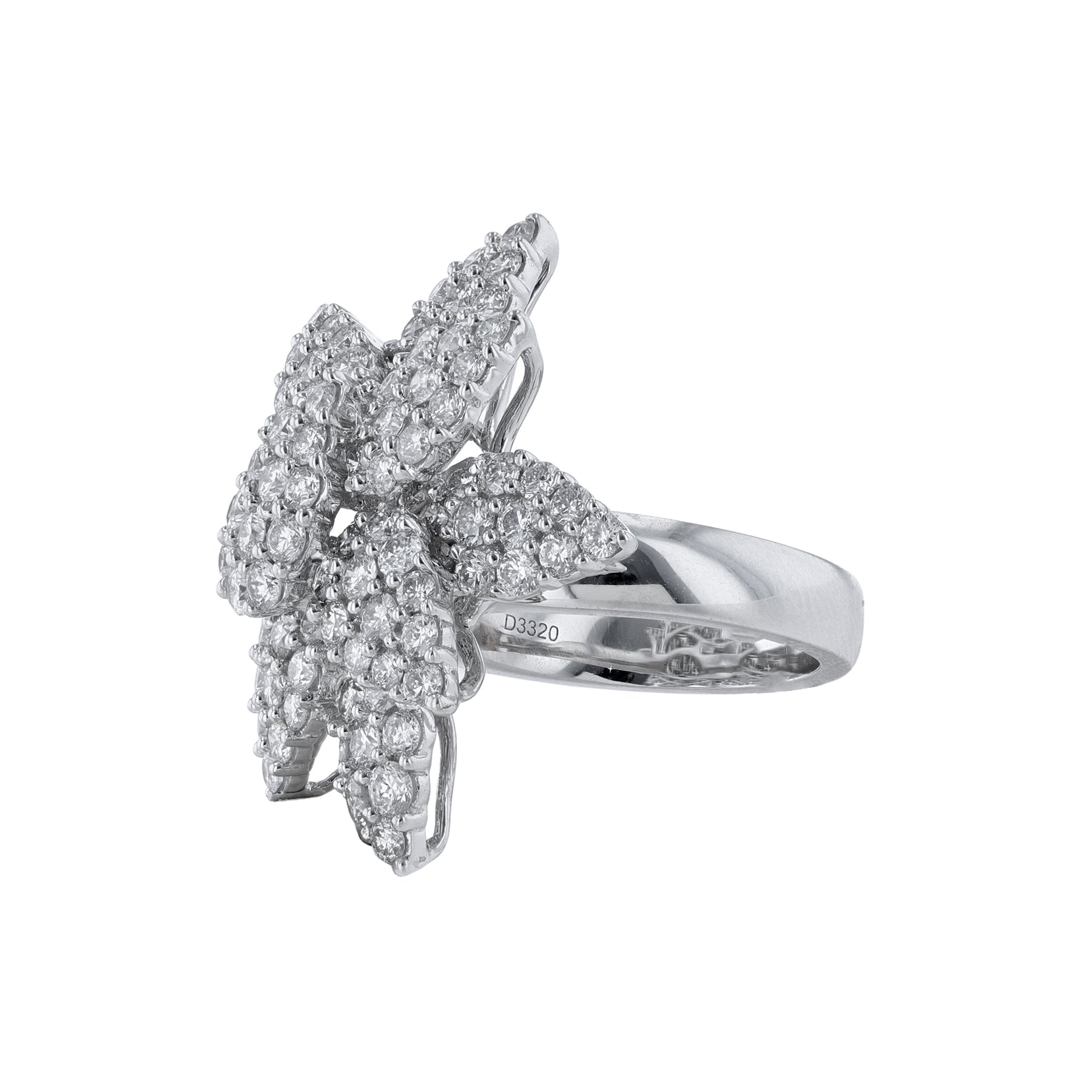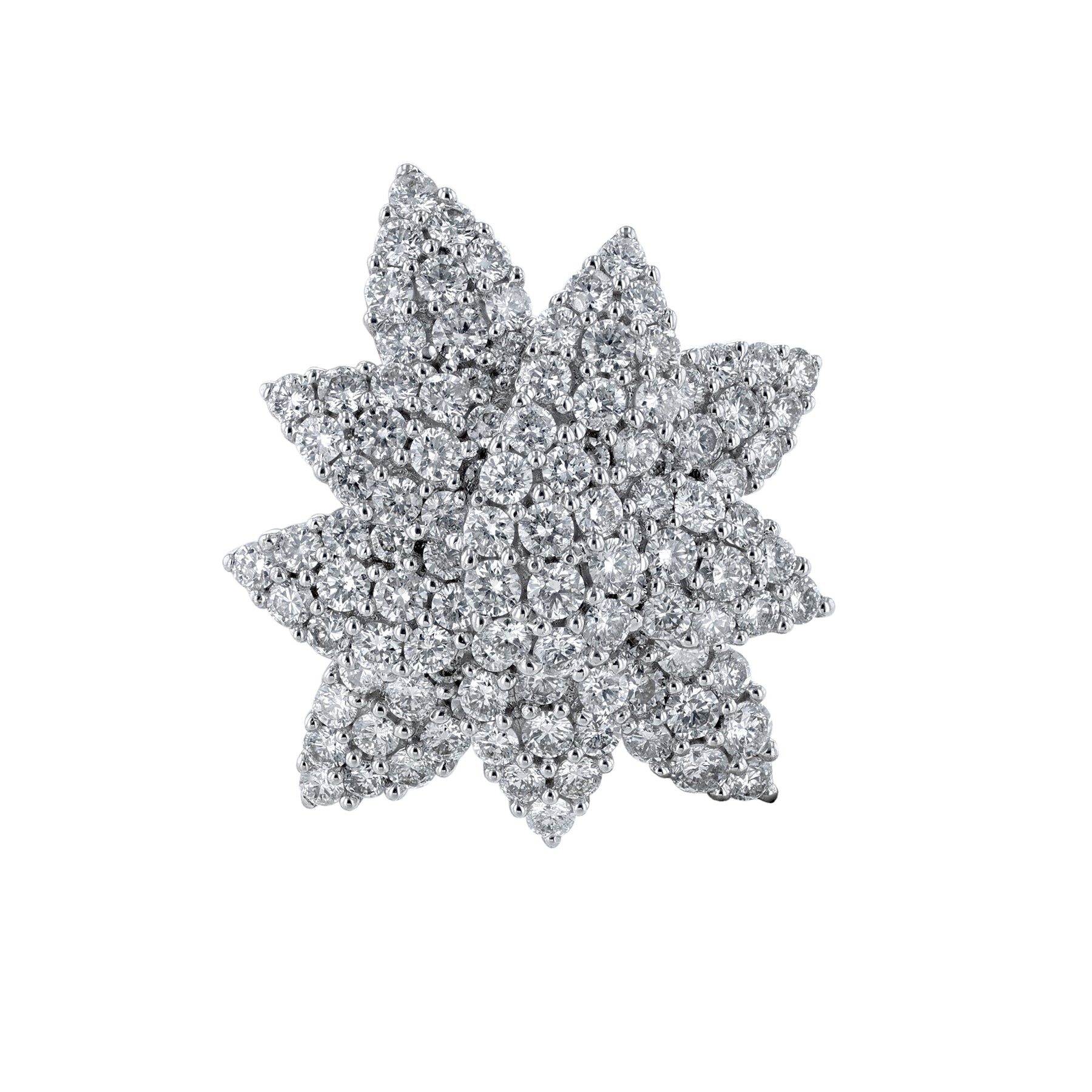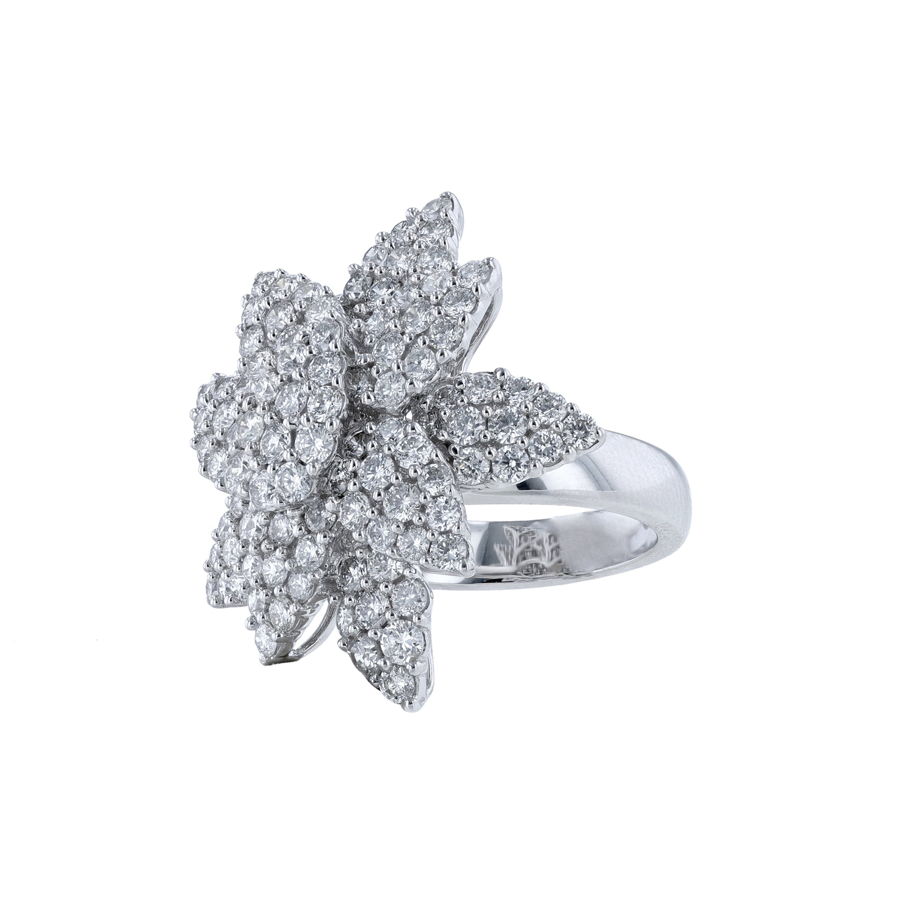 This ring is 18K white gold and features ten petals encrusted in round cut diamonds. Weighing 3.32 carats combined.