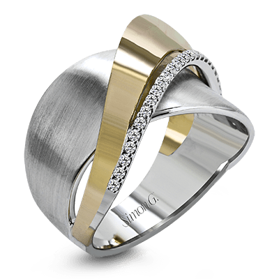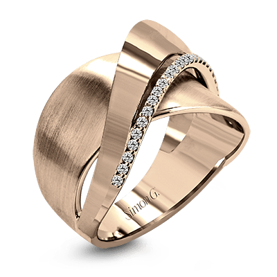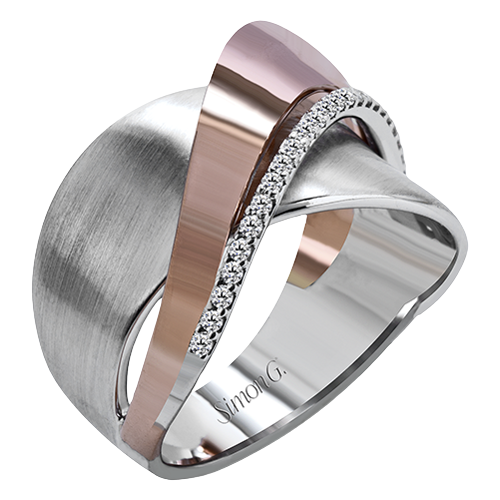 Additional Description | 18k rose and white gold combine in this modern, overlapping band, accented by .12 ctw of white round brilliant diamonds. |