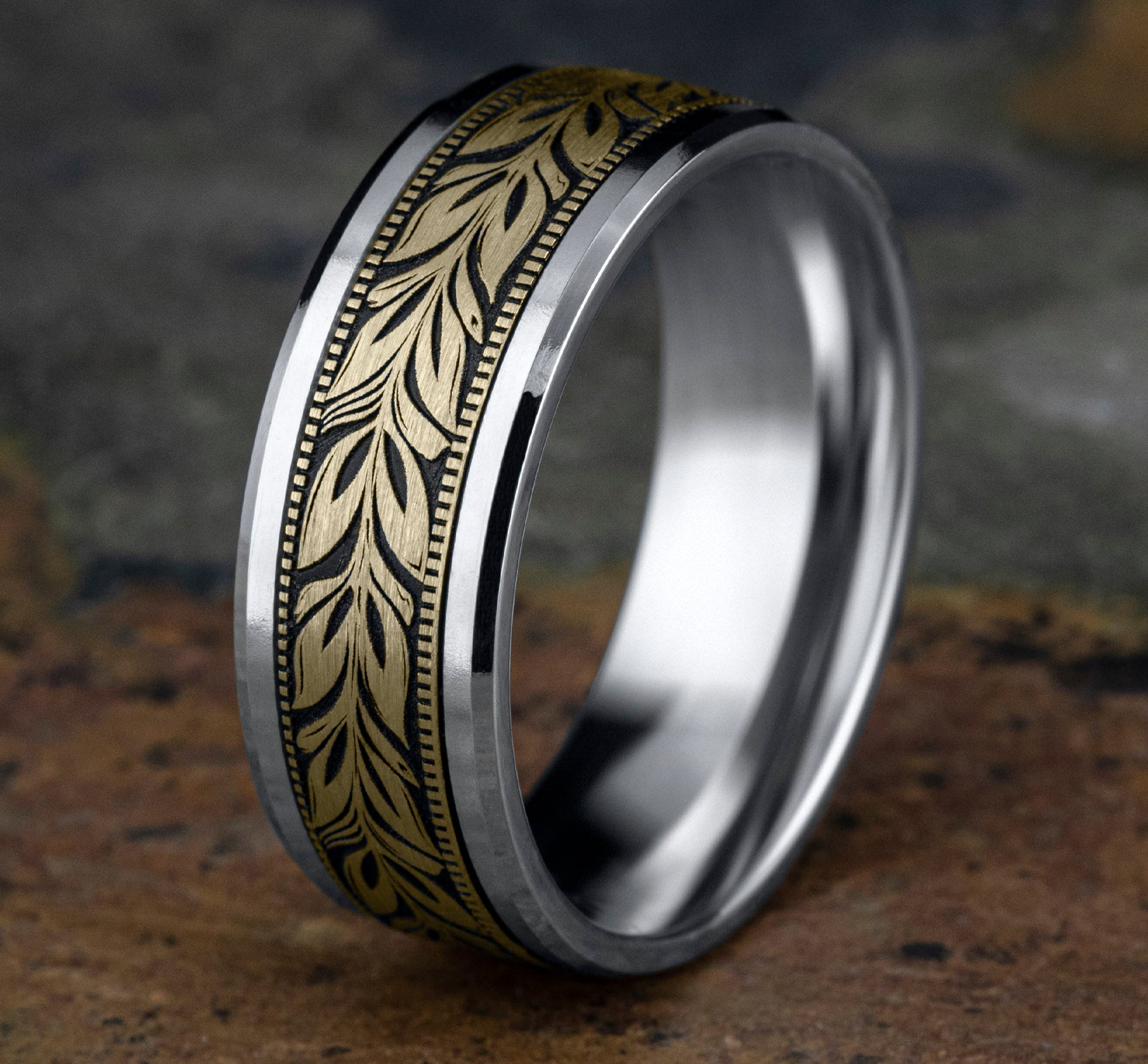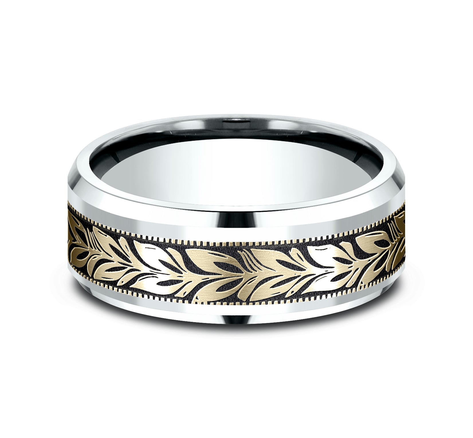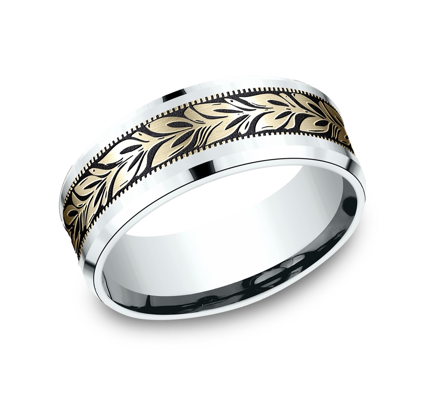 Additional Description | 8mm, Comfort fit 14K White and Yellow Gold Leaf motif with wear resistant black detailing, polished bevel edges |