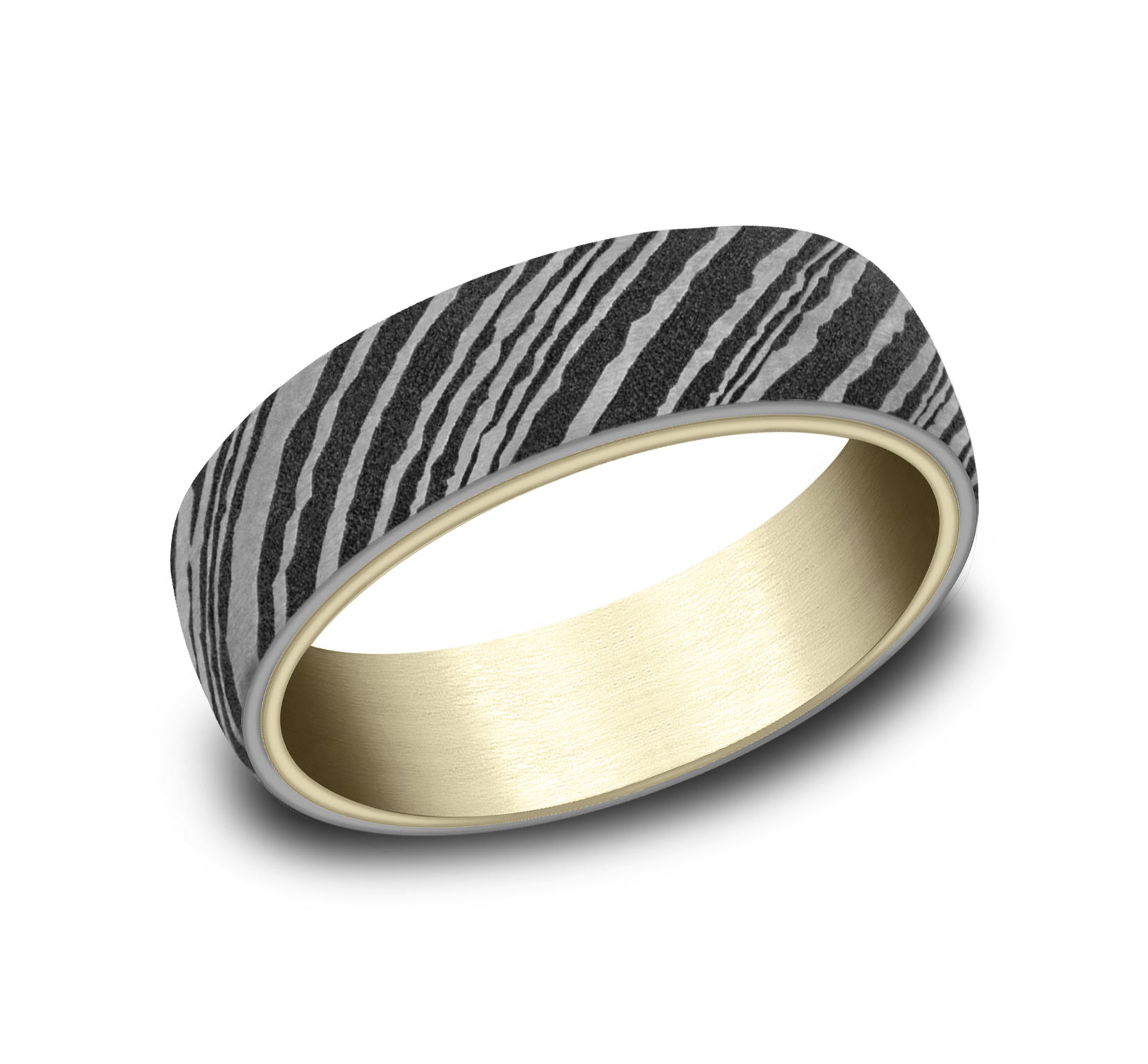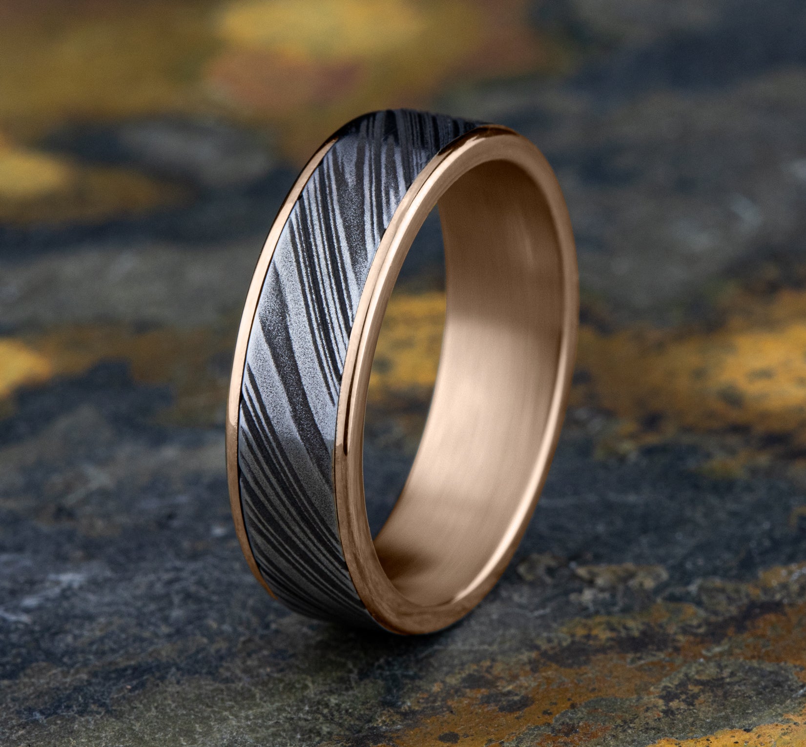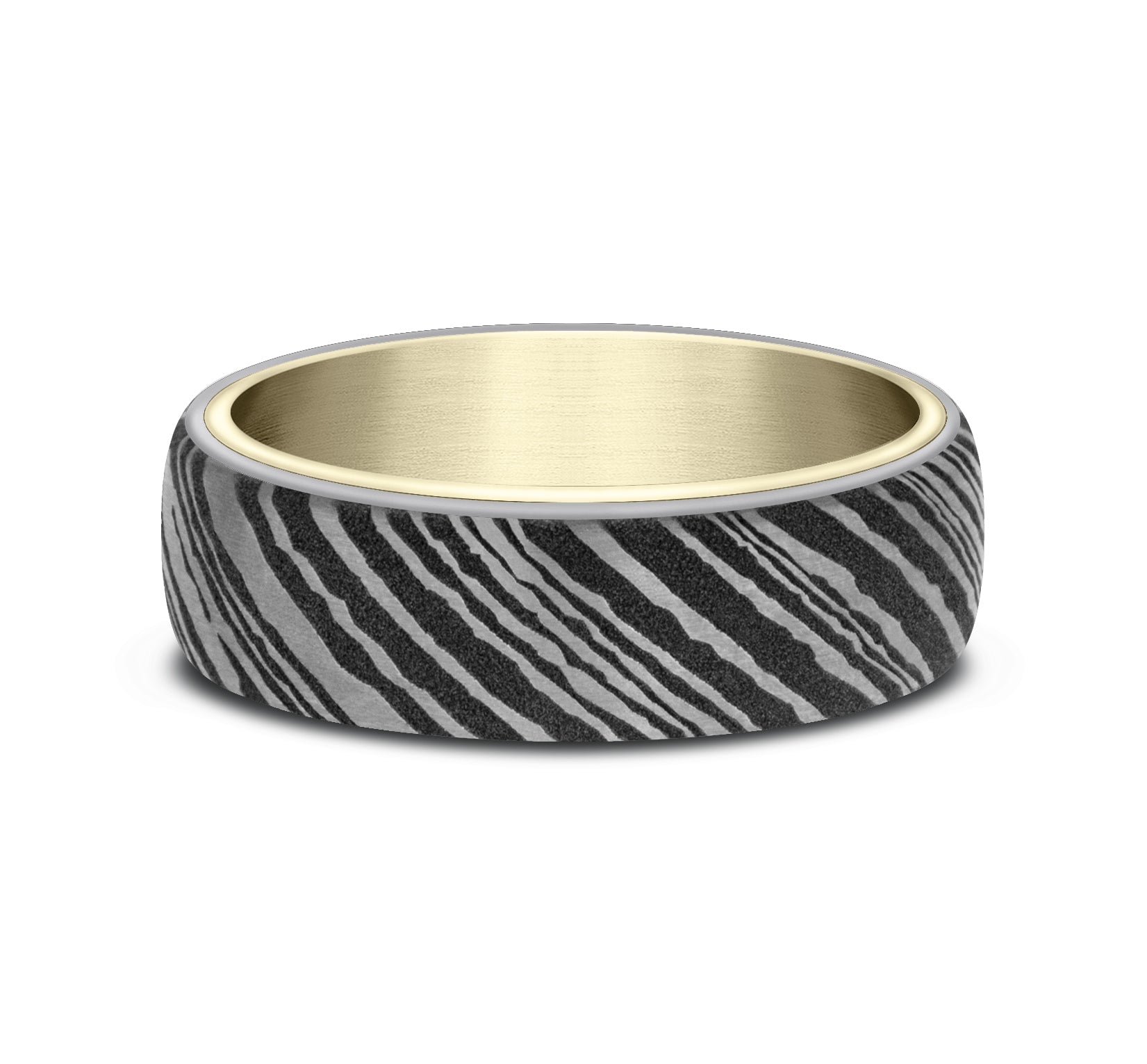 6.5mm, Comfort fit 14K Yellow Gold and Damascus Steel Damascus Steel outer design