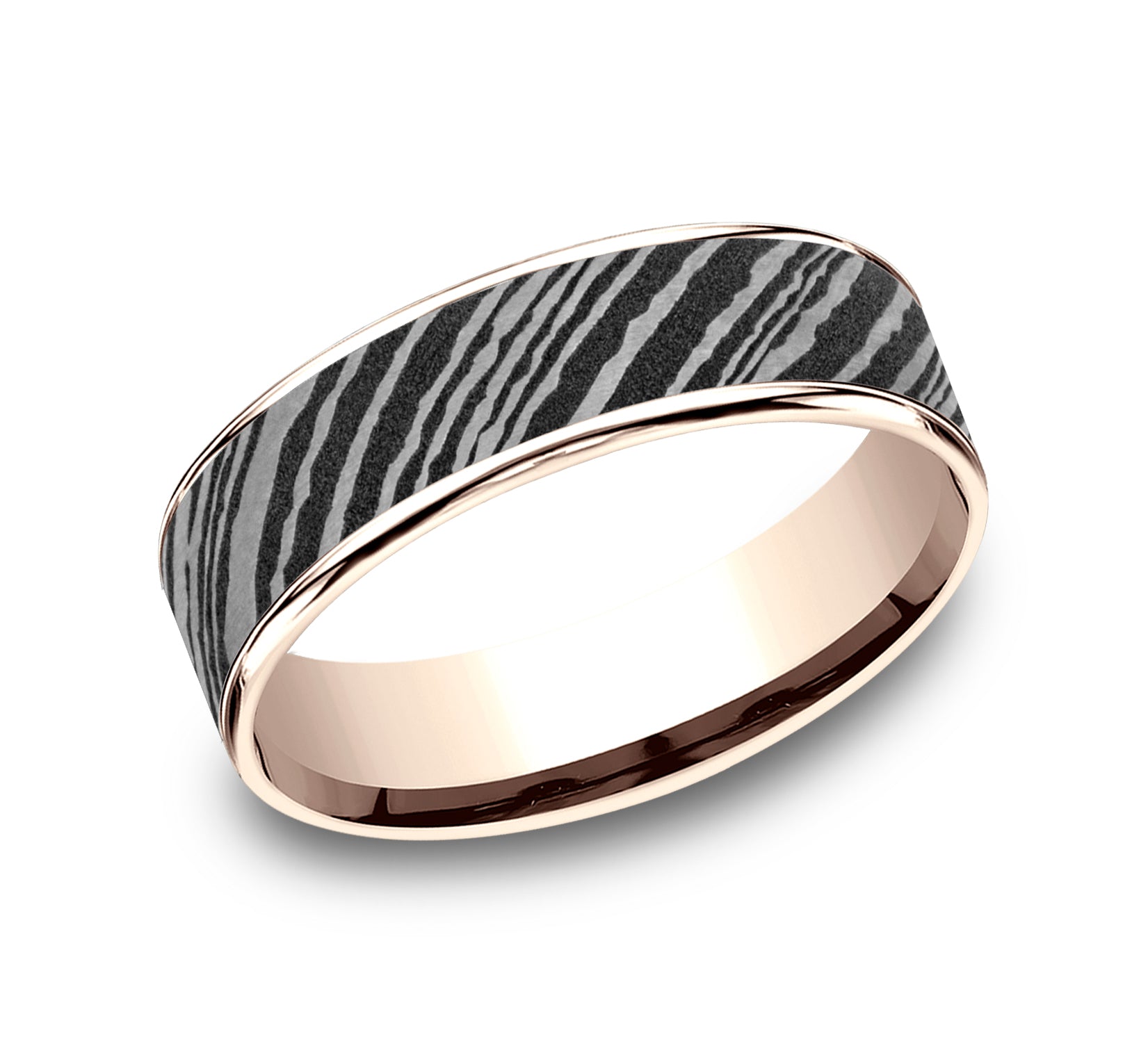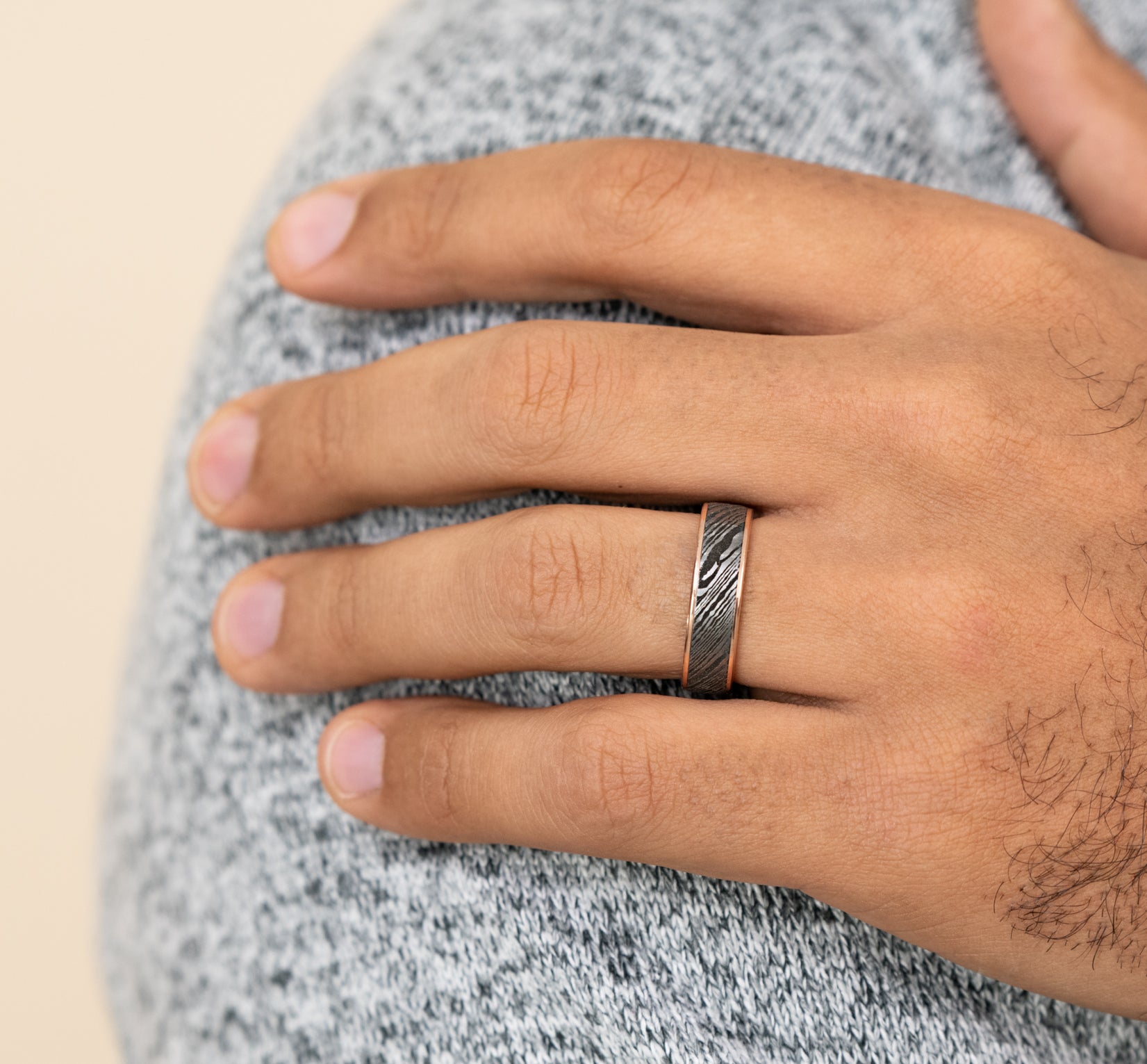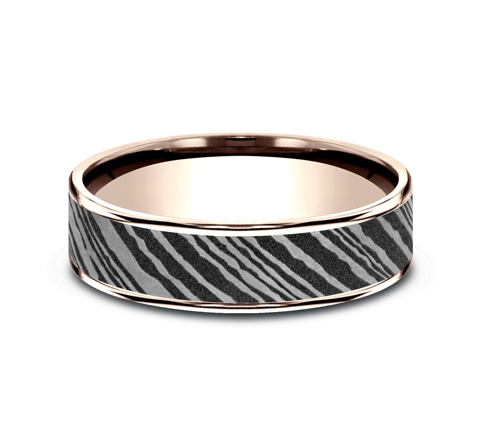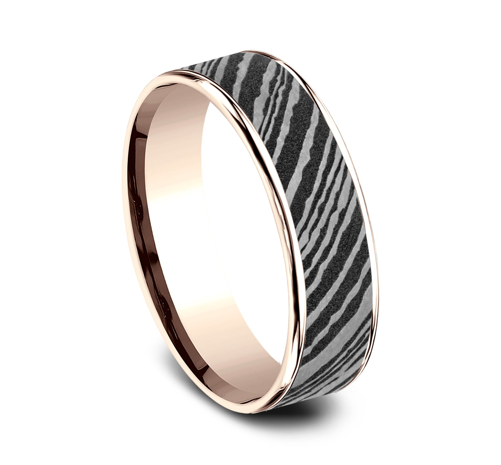 6.5mm, Comfort fit 14K Yellow Gold and Damascus Steel Damascus Steel outer design