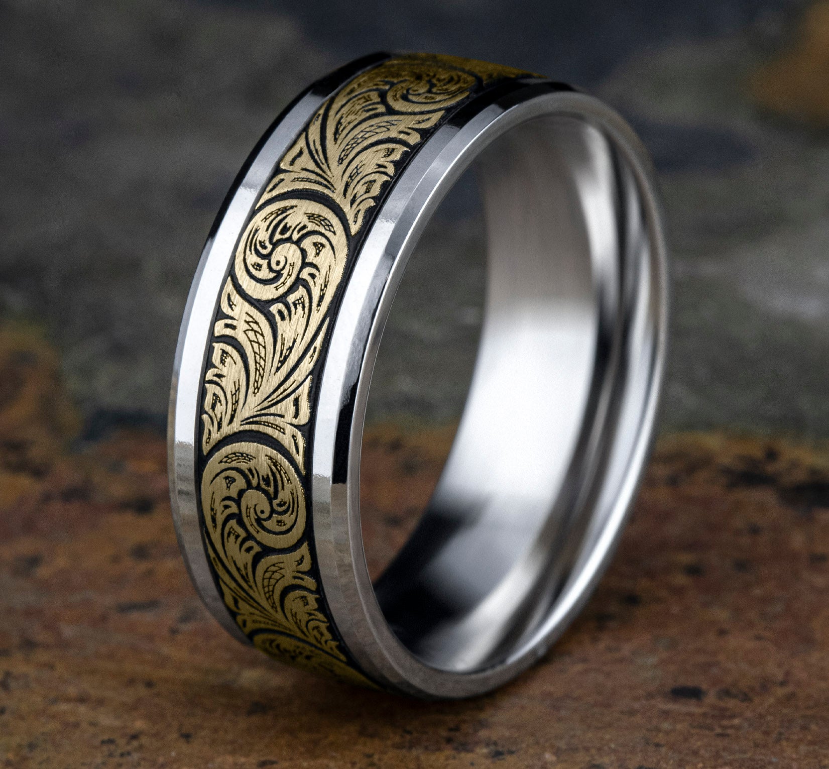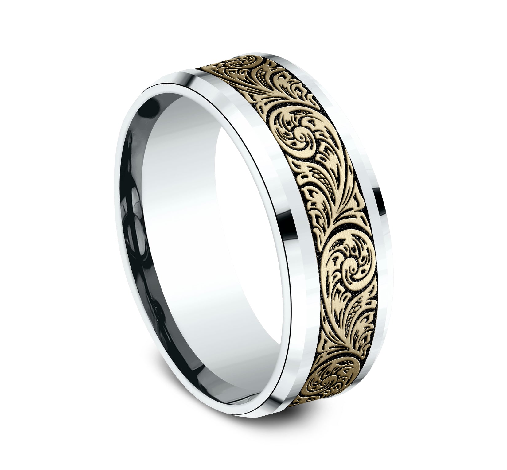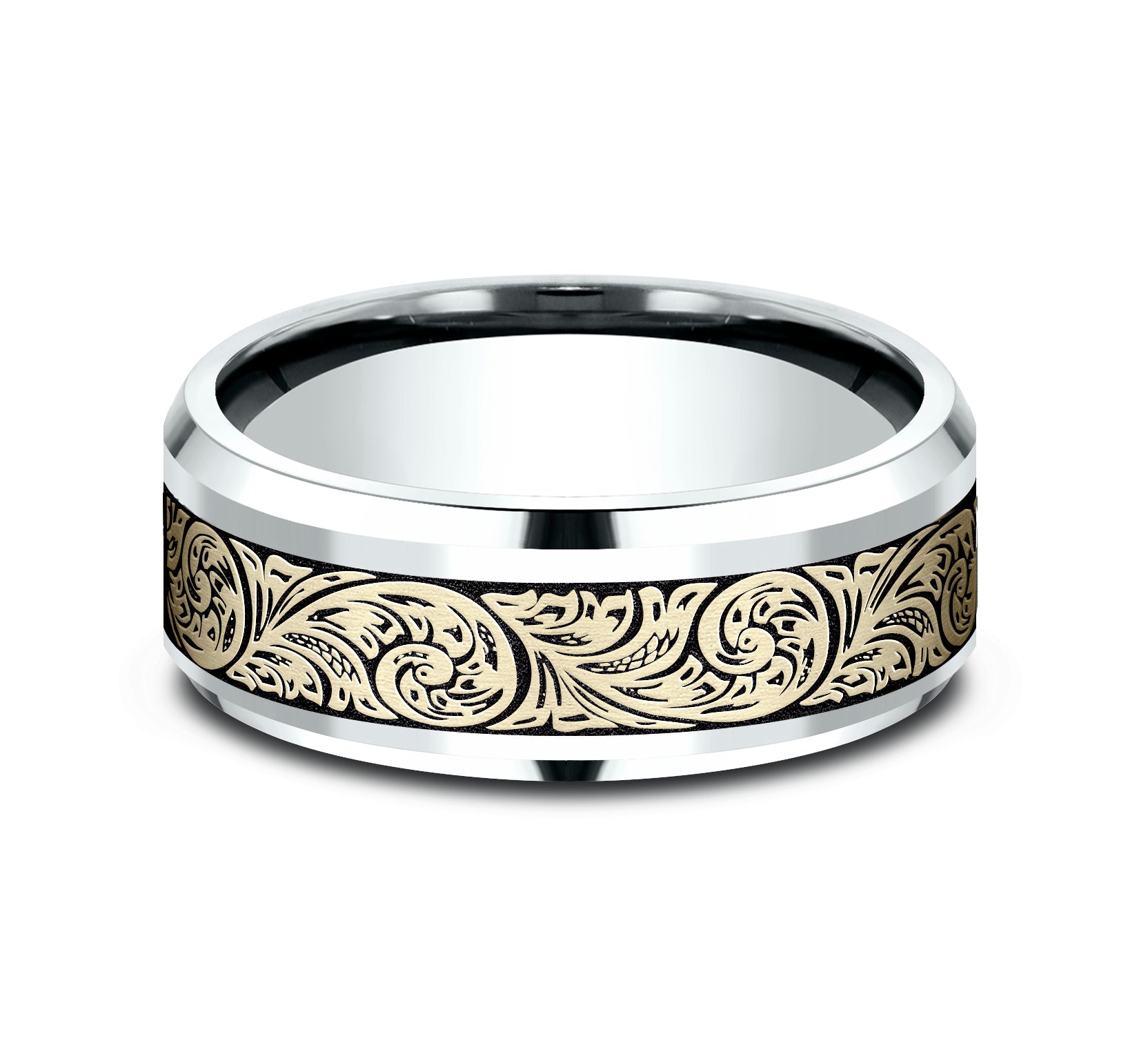 Additional Description | 8mm, Comfort fit 14K White and Yellow Gold Vintage floral script patterned center with wear resistant black detailing, polished bevel edges |