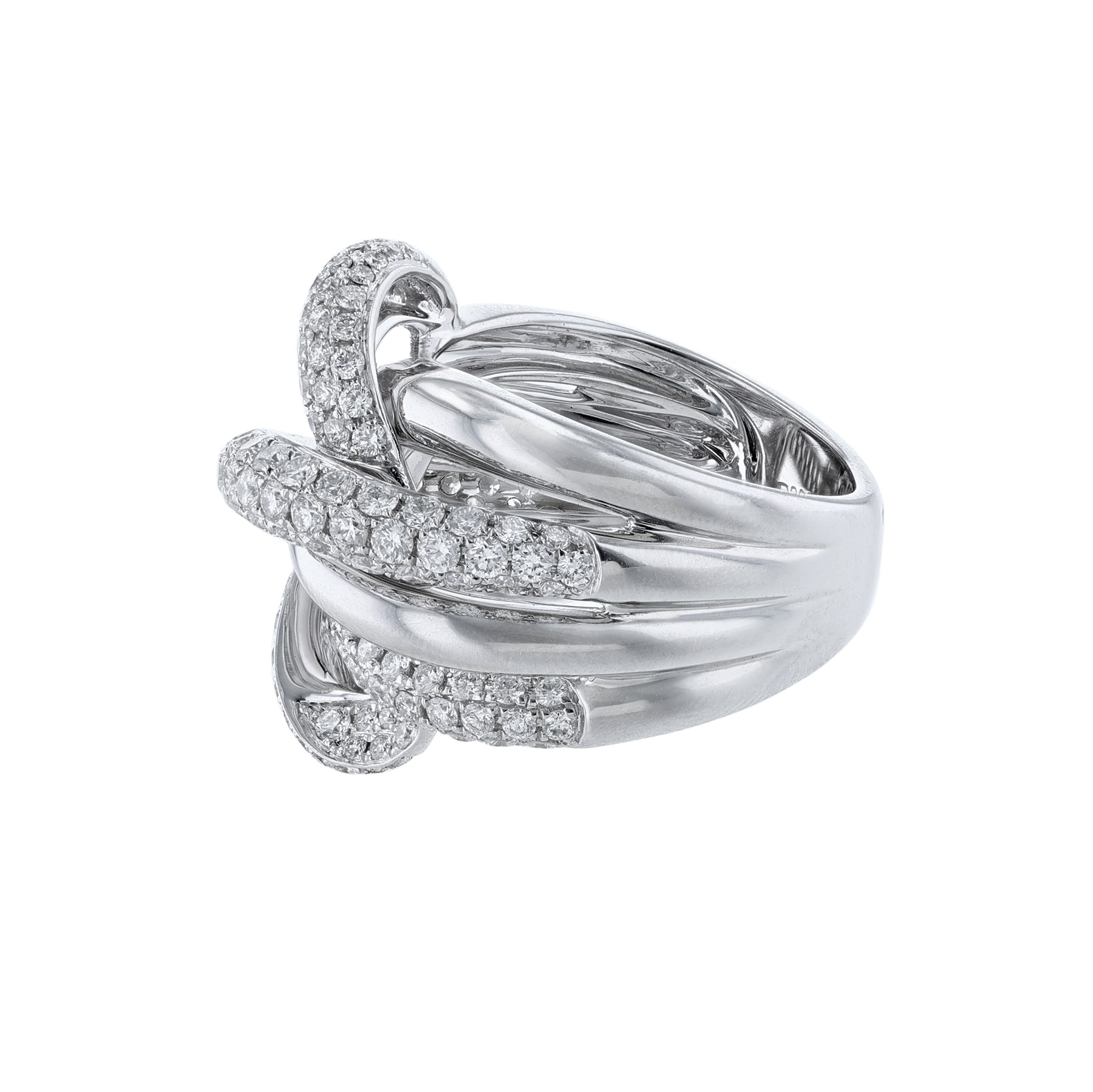 This wrapped cocktail ring is 18K white gold and features 164 round cut diamonds. Weighing 2.07 carats.