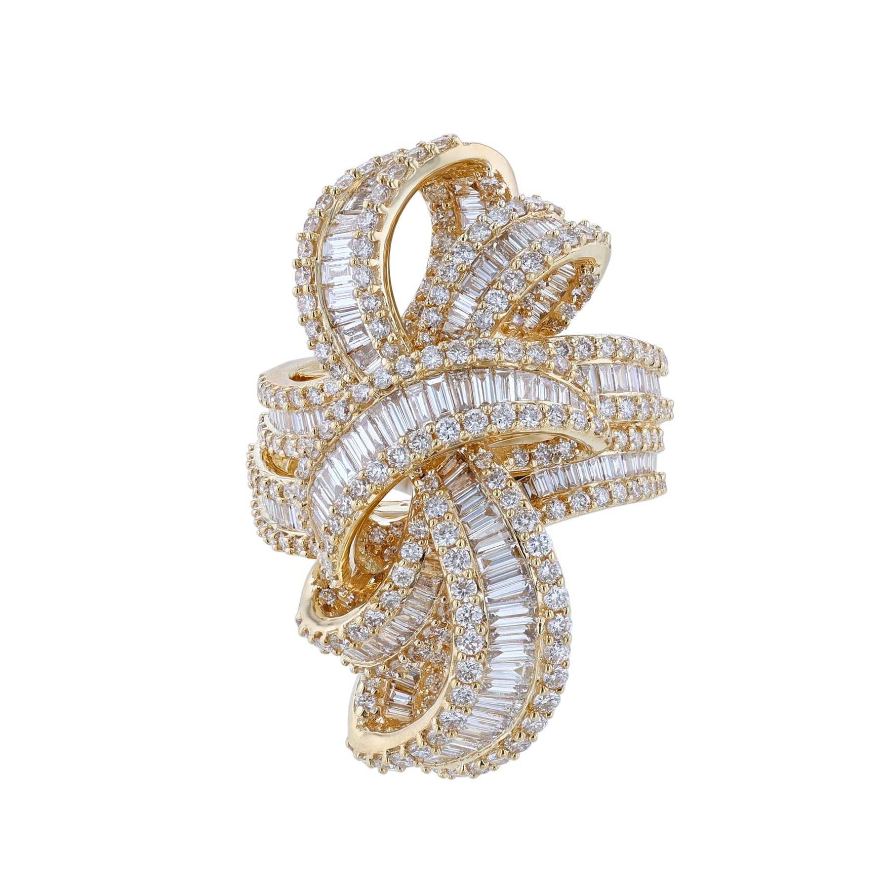 This loose twisted knot cocktail ring is 18K yellow gold and features 183 channel set, baguette and 272 round cut, prong set diamonds. Weighing 4.39 carats.
