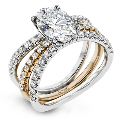 Additional Description | This distinctive bridal set design features a double-layer wedding band that fits around the engagement ring. The set contains .77 ctw of white diamonds. Center stone not included. Our rings can be designed to fit any center stone. |