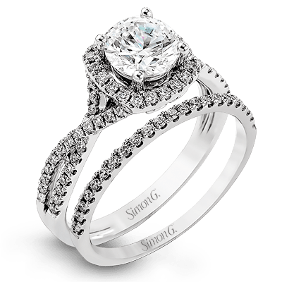 Additional Description Presenting a lovely twisted shank design, this contemporary white gold engagement ring and wedding band set is accentuated with .44 ctw round cut white diamonds. Center stone not included. Our rings can be designed to fit any center stone.