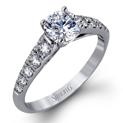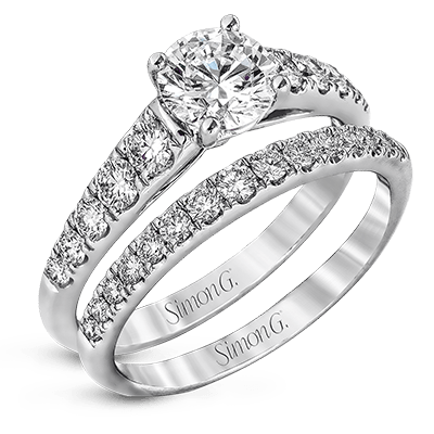 Additional Description Elevating a classic design with modern elements, this exquisite white gold engagement ring and band are emphasized by .77 ctw of sparkling round cut white diamonds. Center stone not included. Our rings can be designed to fit any center stone.