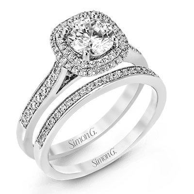 Additional Description | Showcasing a dazzling halo, this contemporary white gold wedding set is highlighted by .45 ctw of arresting round cut white diamonds. Center stone not included. Our rings can be designed to fit any center stone. |