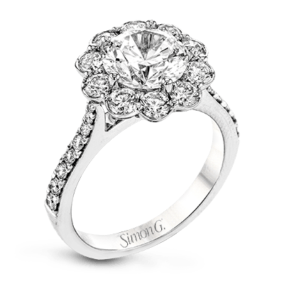 Additional Description | This white gold wedding set frames its centerpiece with .90 ctw of round white diamonds in a whimsical floral-inspired design. Center stone not included. Our rings can be designed to fit any center stone. |