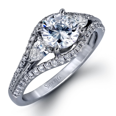 Additional Description This 18K bridal set features a 3-stone engagement ring that takes a RD center with 2 pear shaped diamond sides 0.32 ctw, a split shank, and is outlined by round white diamonds 0.40 ctw. with Matching diamond band 0.14 ctw Center stone not included. Our rings can be designed to fit any center stone.
